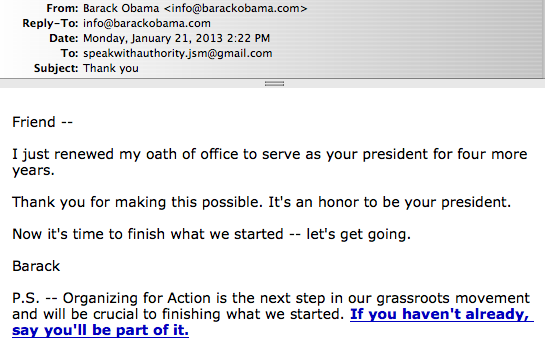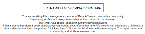 Assuming that Organizing for Action doesn't just send out emails on anyone's behalf, the president exercised whatever authority he has in the new organization to deliver this message to perhaps millions of Americans. The link in the email is to a sign-up page for the new organization where users may entering an email address, after which the ubiquitous OFA Donations page appears. And despite the fact that the email above says "paid for by Organizing for Action," the disclaimer at the bottom of the donations page says "Contributions or gifts to Obama Victory Fund 2012 are not tax deductible.